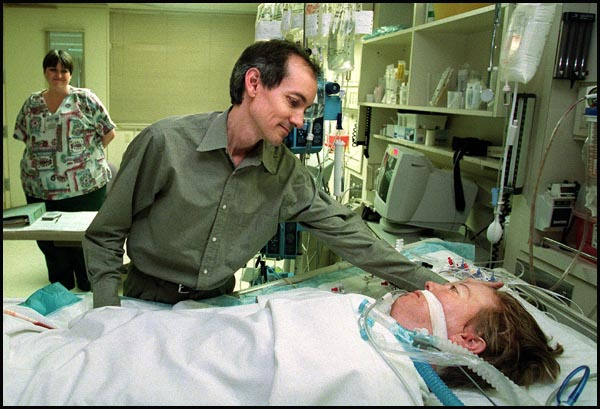 Bob greets a just awakened Marcia while RN Dorothy Nuusilla hovers close-by in the Surgical Intensive Care Unit. Surgeons closed her chest cavity in the morning but left her on the ventilator while her condition continues to stabilize.
